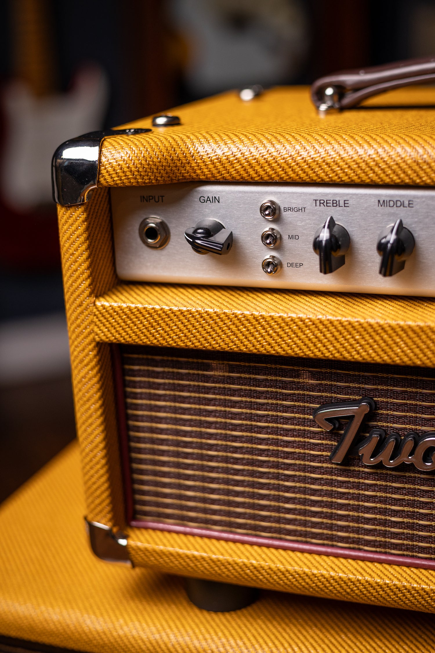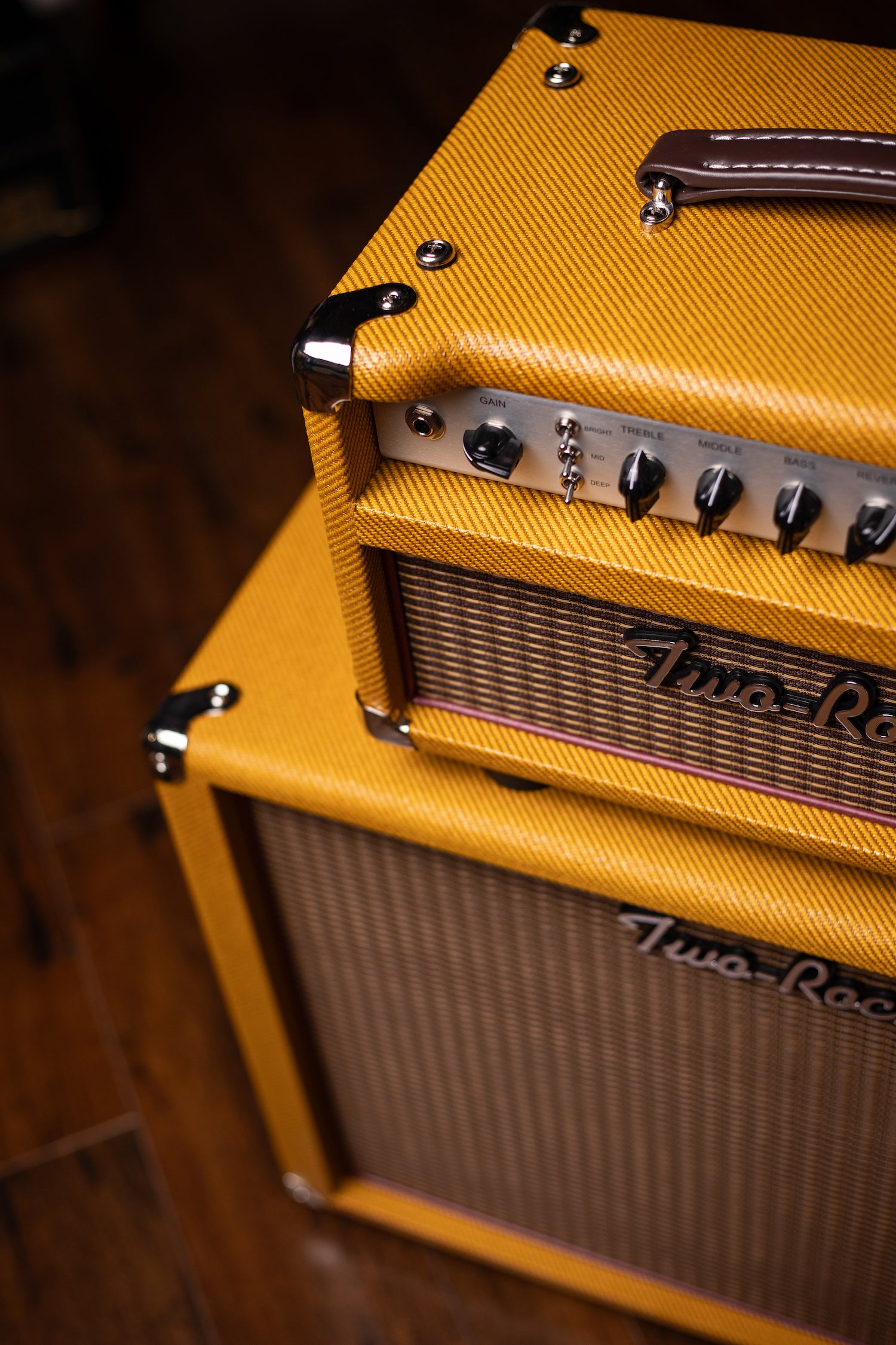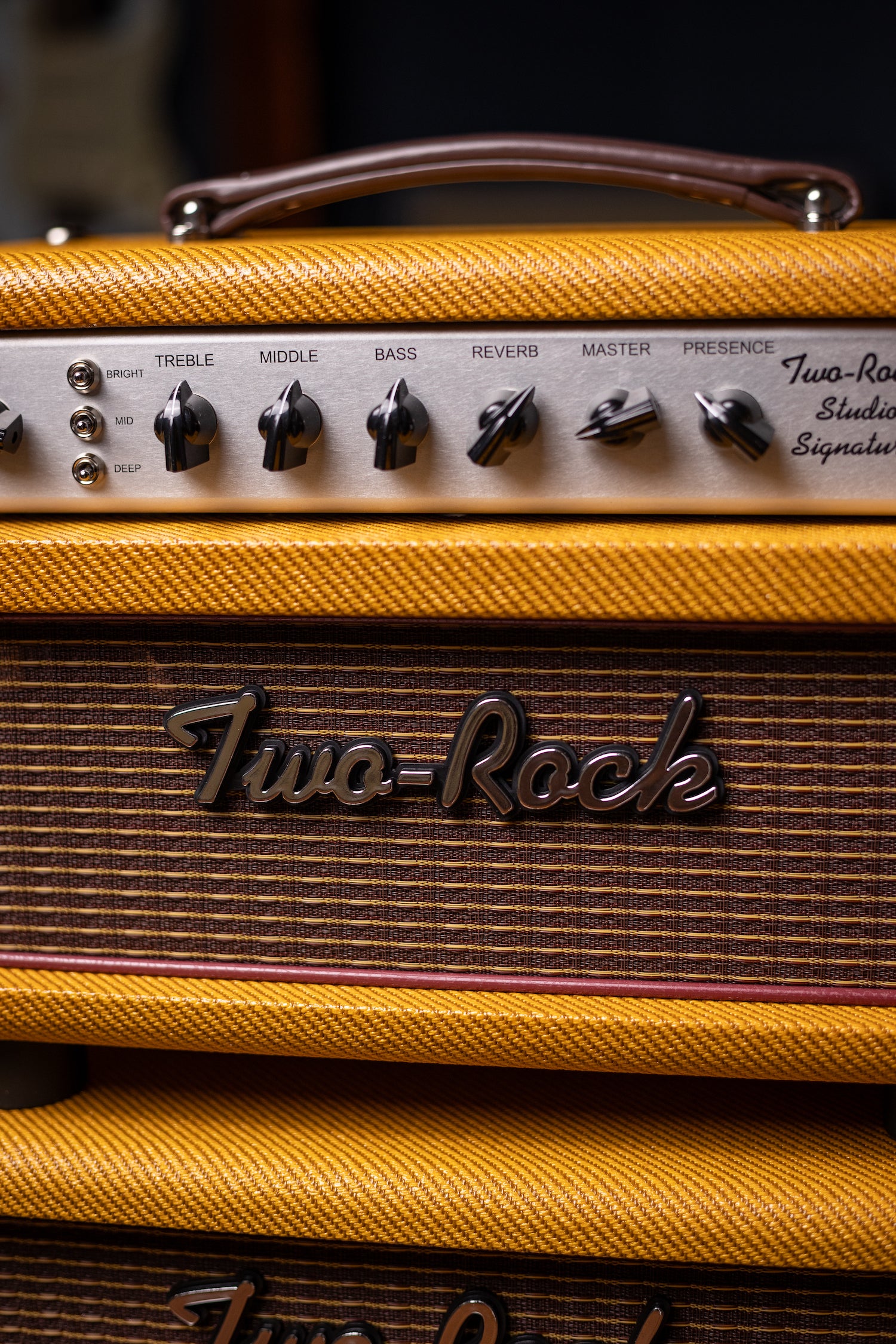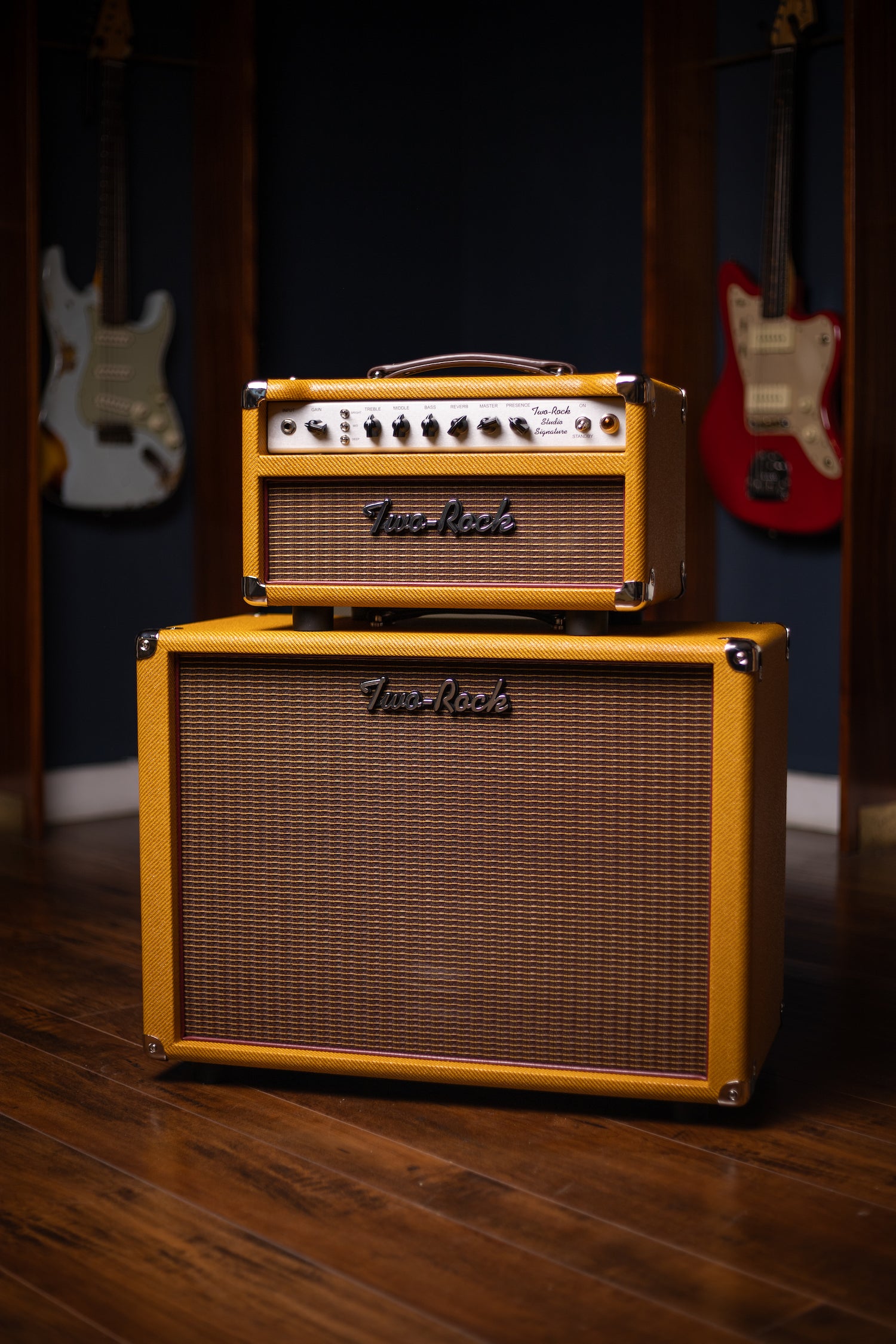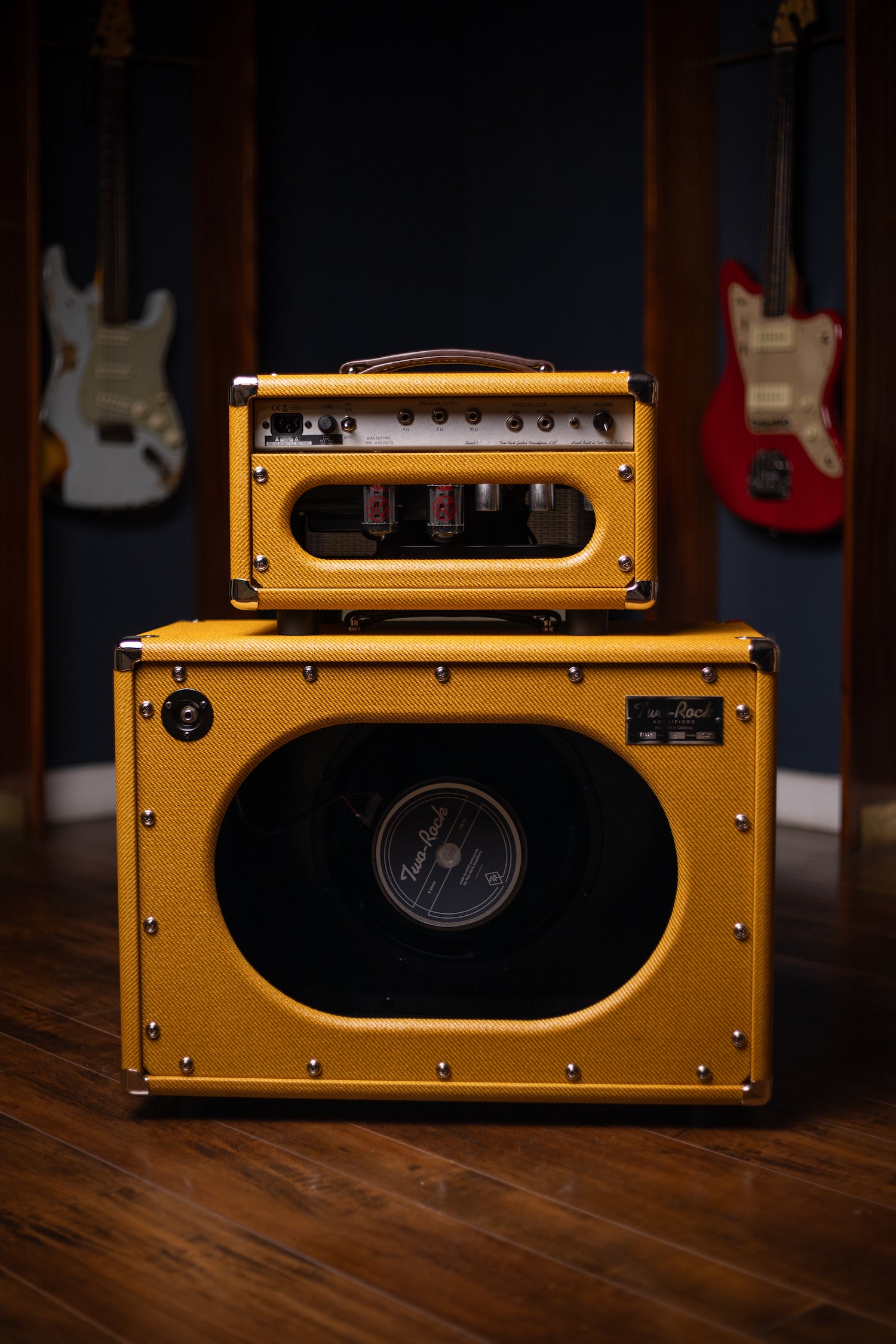 Two-Rock Studio Signature 120v Head and 1x12 Open Back 2R12 Speaker Cabinet - Amber Lacquered Tweed, Silver Anodized, Oxblood Stripe Cloth, Black Knobs, Maroon Pipping