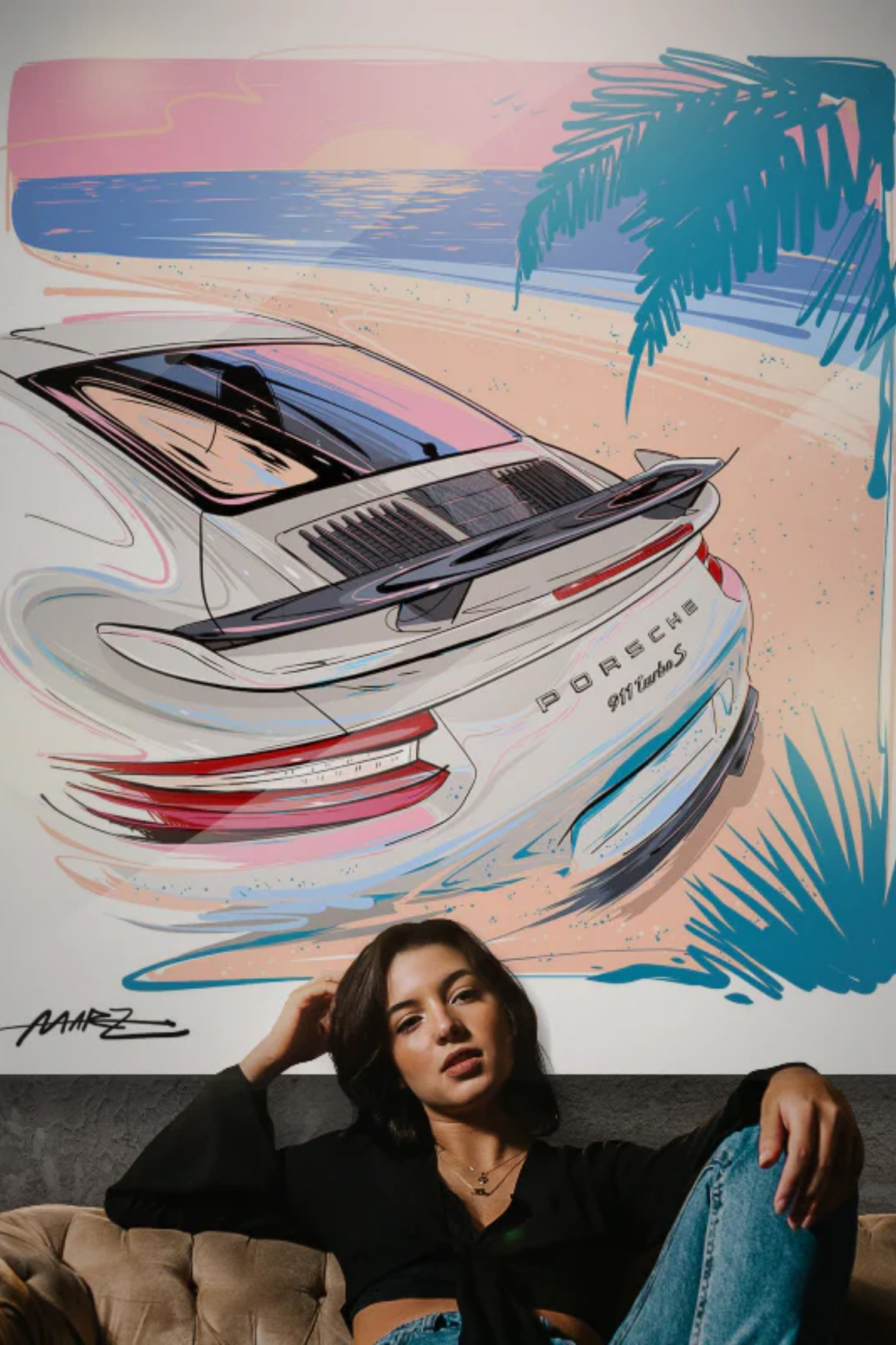 The 2018 Porsche Turbo S Exclusive in Miami Beach LIMITED EDITION (1 of 50) Alex Marz was inspired by the sunset colors of Miami and how the vehicle reflects its environment. He has re-imagened artistically with sweeping calligraphic lines and reflections, an artistic element that describes Alex Marz' signature art style. As a former designer at Porsche Group/Audi LA, Alex visually showcases a unique style that blends art, industrial design, composition and class.