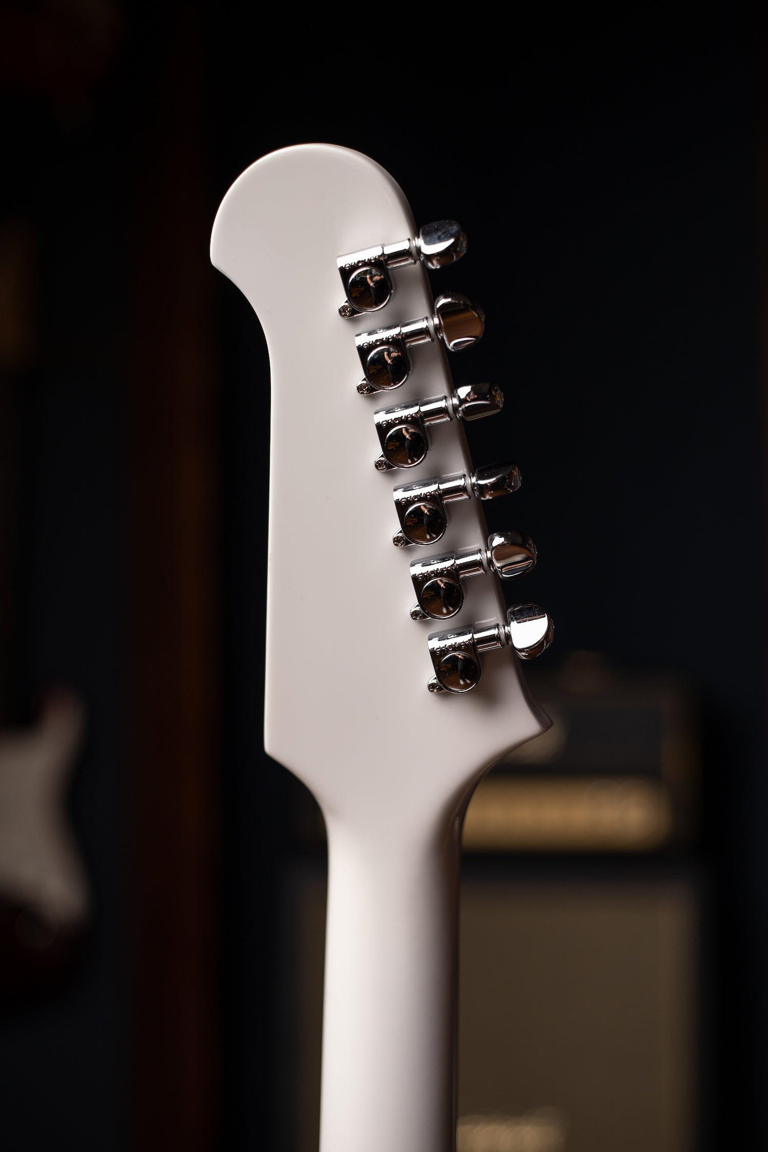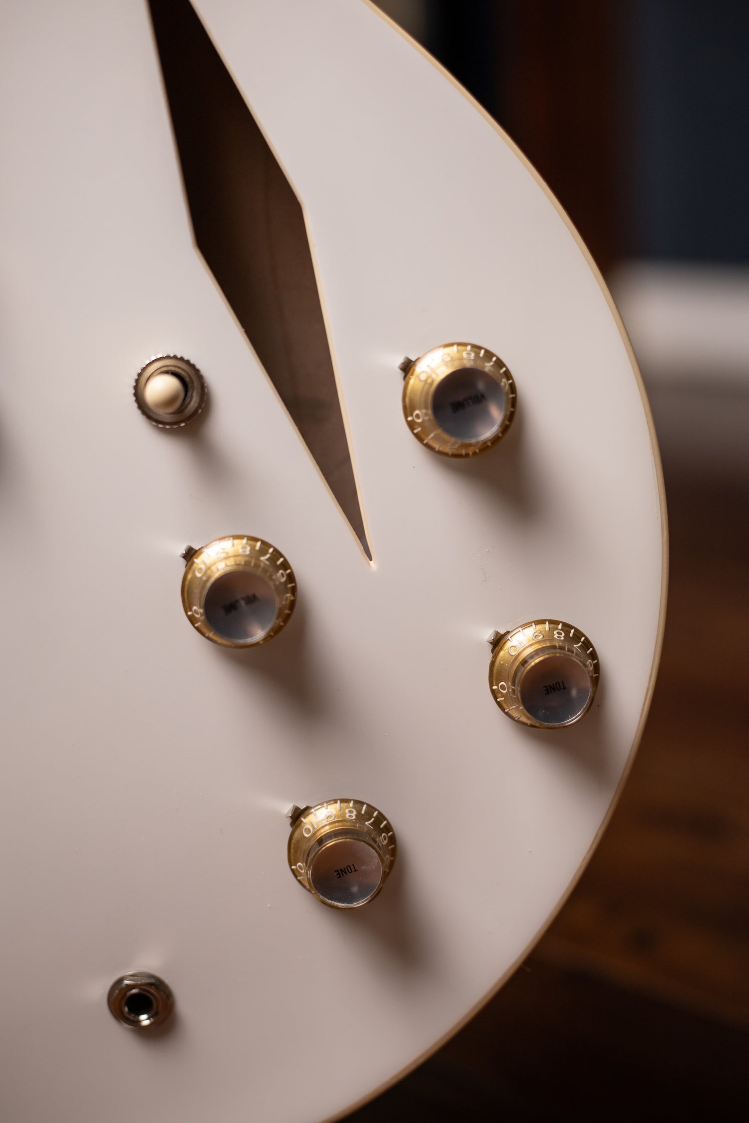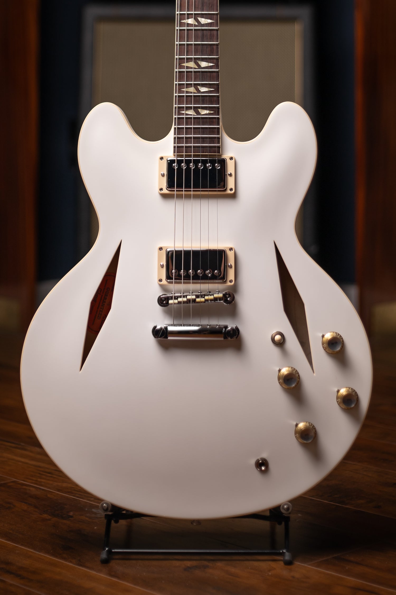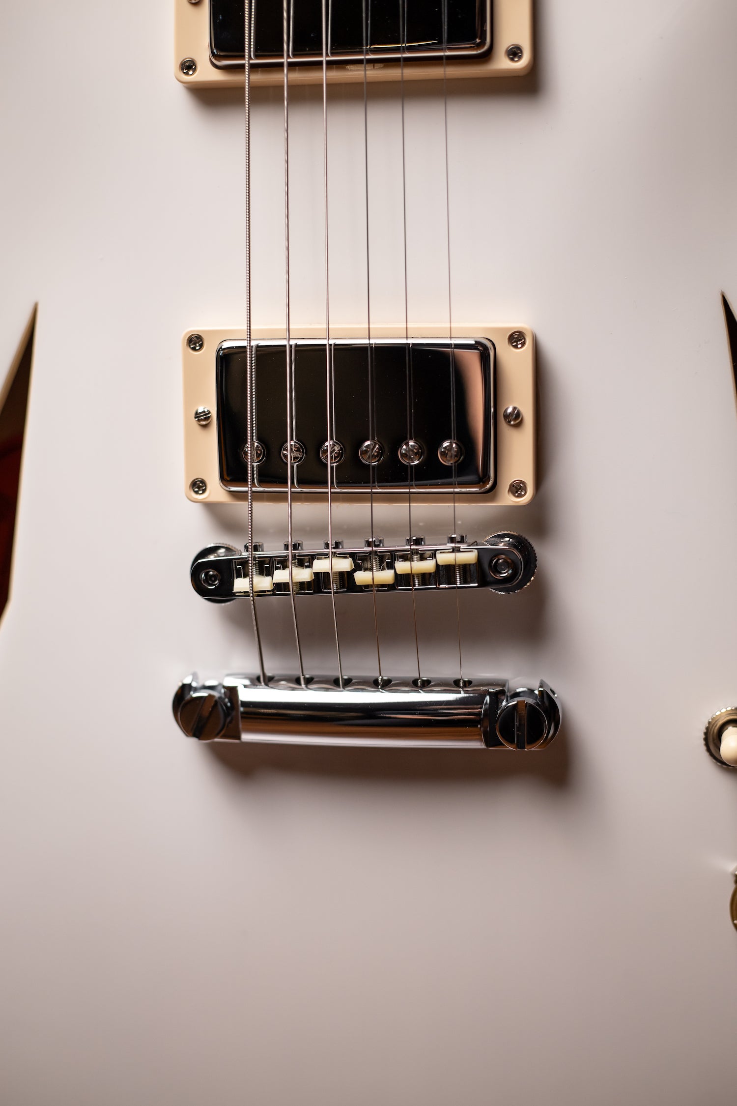 Limited edition of 50 guitars finished in Alpine White nitrocellulose lacquer. Bound three-ply maple/poplar/maple body with bound diamond sound holes, mahogany neck with custom Dave Grohl profile, rosewood fretboard with cellulose split diamond inlays, TonePros ABR-1 bridge and Stop Bar tailpiece, Custombucker pickups, artist-signed sound hole label, hardshell case