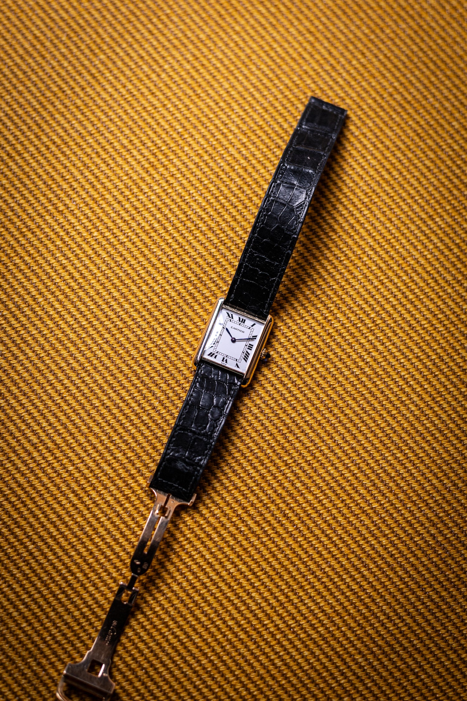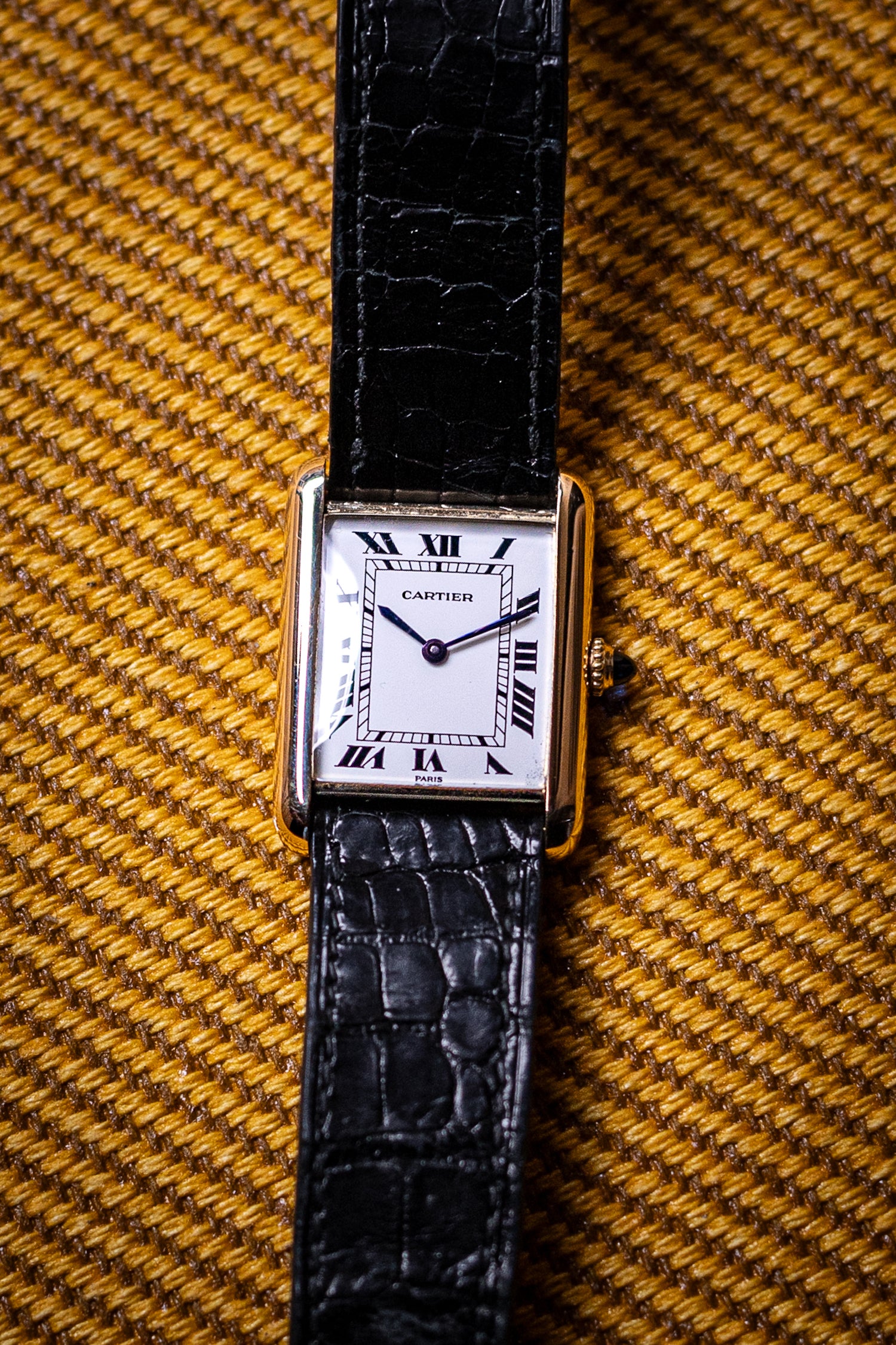 This example, believed to be from 1980, is built in solid 18k yellow gold, unlike the far more common vermeil (gold-plated silver) Tanks on the market. Despite its ultra-slim 6.5mm case thickness, it’s powered by an in-house manually wound mechanical movement, a significant technical achievement for that era. The white enamel lacquer dial is especially well-preserved, with crisp black Roman numerals, railroad minute track, and the signature blued sword hands. The printing is clean and sharp, with no signs of discoloration or fading. The case and original buckle show minor surface wear consistent with age, and the original blue cabochon crown is still present.