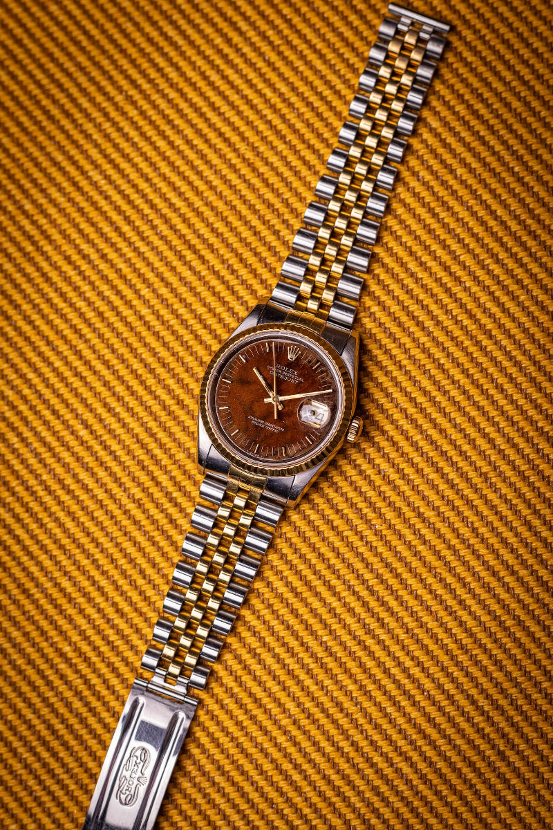 Throughout the years, Rolex has experimented with unique dial materials, offering everything from stone to mother-of-pearl—but few are as striking as the wood dials. Particularly, the reference 16233 offers a beautiful balance of 18k yellow gold and stainless steel, representing the quintessential two-tone Datejust.