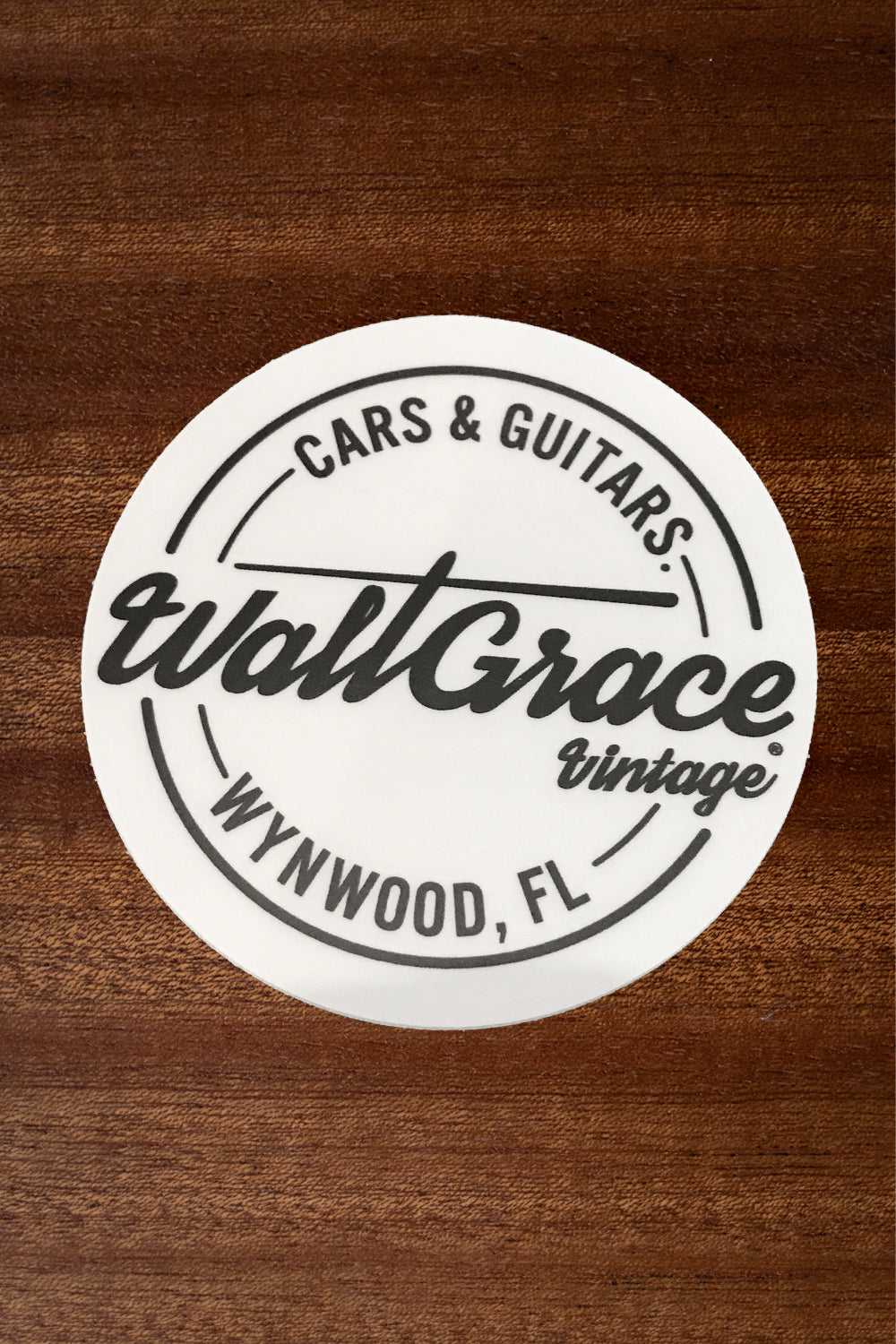 Throw some Walt Grace flair on your laptop, notebook, guitar case - or guitar! - with our white Walt Grace Vintage sticker! Circular and with a 2" diameter.