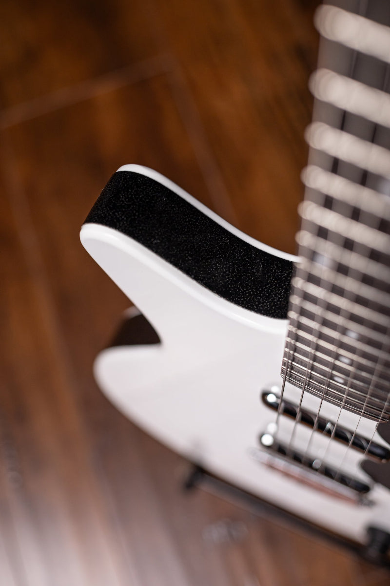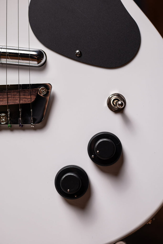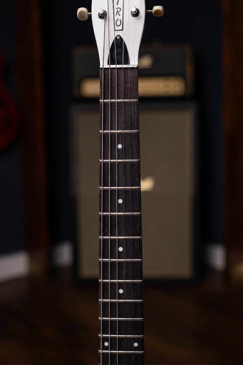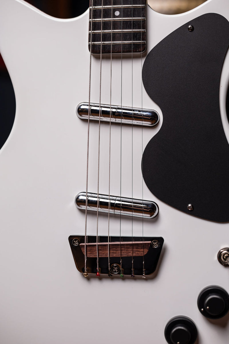 The Danelectro PB Special in white finish is a modern reimagining of the brand's iconic 1950s semi-hollowbody guitars, blending vintage aesthetics with contemporary playability. Its distinctive design features a semi-hollow spruce body with a hardboard top, complemented by an F-hole and crème binding, all set against a rich finish. The bolt-on maple neck with a rosewood fingerboard offers a comfortable C-shaped profile, 14" radius, and 25" scale length, ensuring smooth playability across its 21 frets.