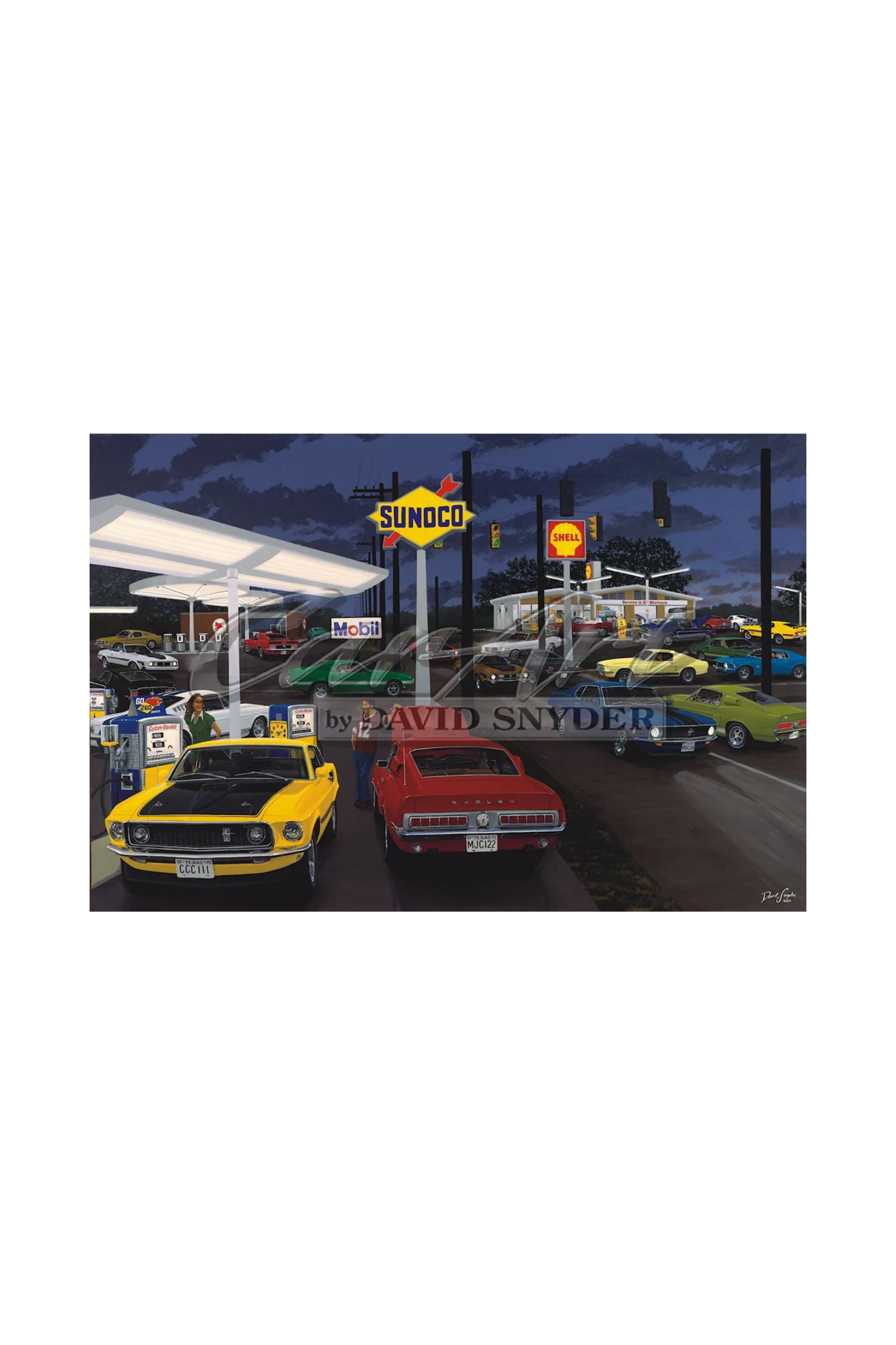 Mustang was first offered for sale to the public on April 17, 1964. Twenty-two thousand Mustangs were sold that day. A year later over 400,000 Mustangs were on the road. Mustang became the most iconic "pony car" of the muscle car era. Artist David Snyder has portrayed some of his favorite Mustangs in his newest painting "Feeding The Herd" with memories of the day when a busy gas station on every corner was the norm. The featured Mustangs in this painting are owned by one of Snyder's foremost collectors and the original painting "Feeding The Herd" is now included that collection.