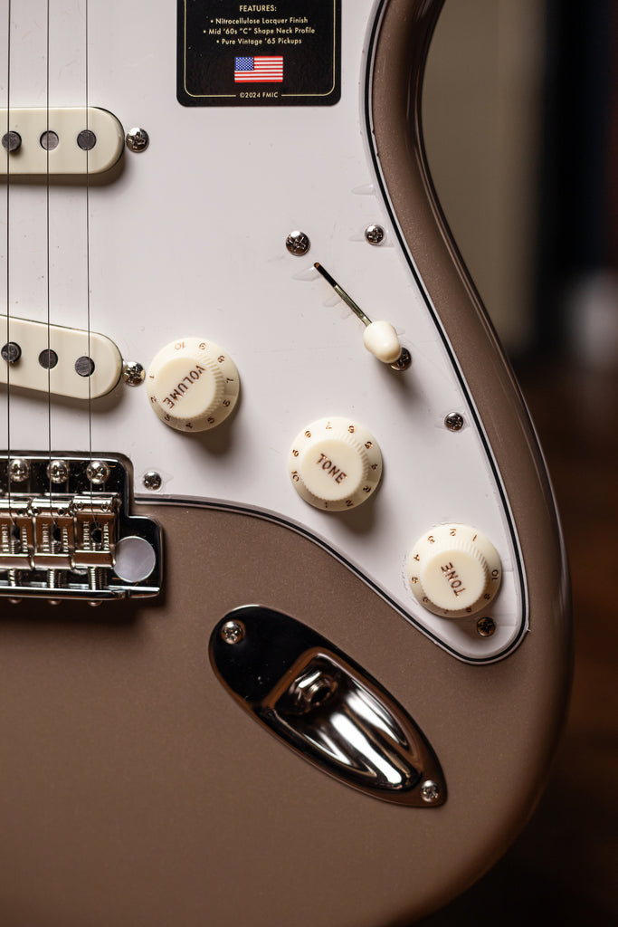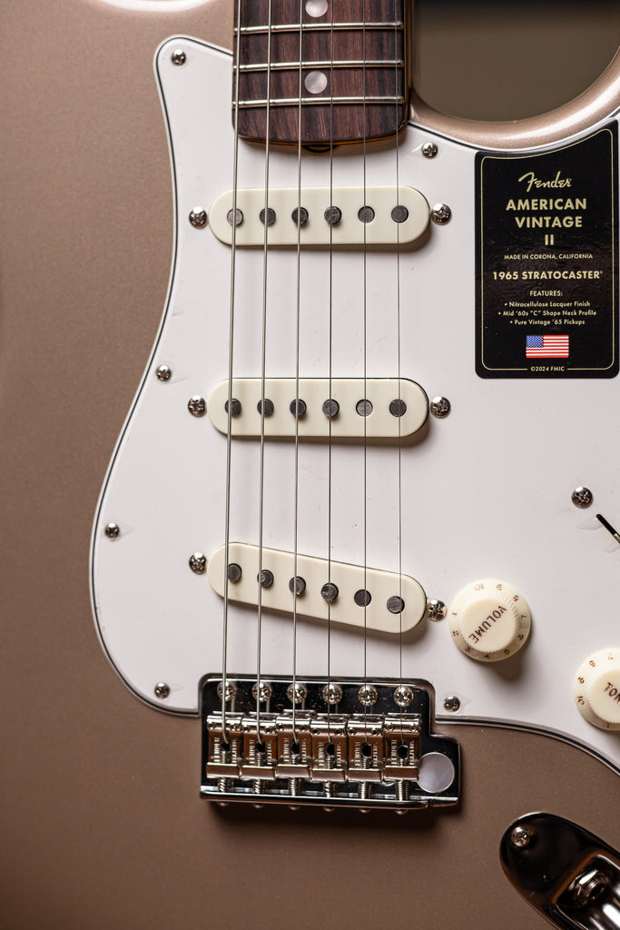 Relive the sound and spirit of 1965 with the American Vintage II 1965 Stratocaster. Smack in the middle of one of music’s most electrifying decades, the Stratocaster in 1965 was an instrument on its way to becoming rock’s greatest electric guitar. A perfect example of a Strat in a transition year, the 1965 Stratocaster® features a 1965 “C”-shaped maple neck, this time with a round-laminated rosewood fingerboard and larger pearl dot inlays. Other authentic features include an 11-hole three-ply white pickguard, the incredibly cool transition logo with larger lettering, and a set of amazing “gray bottom” Pure Vintage 1965 pickups.