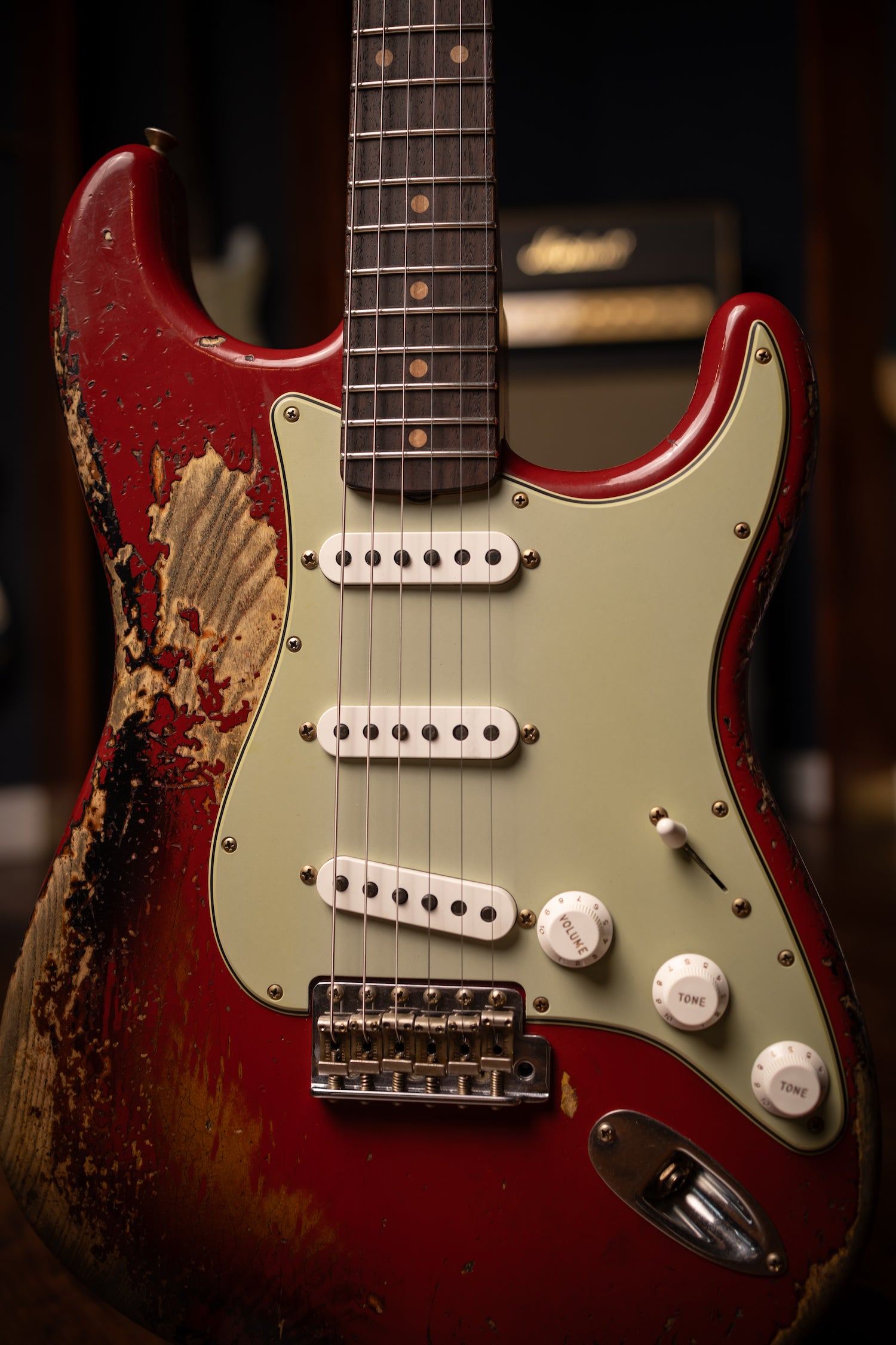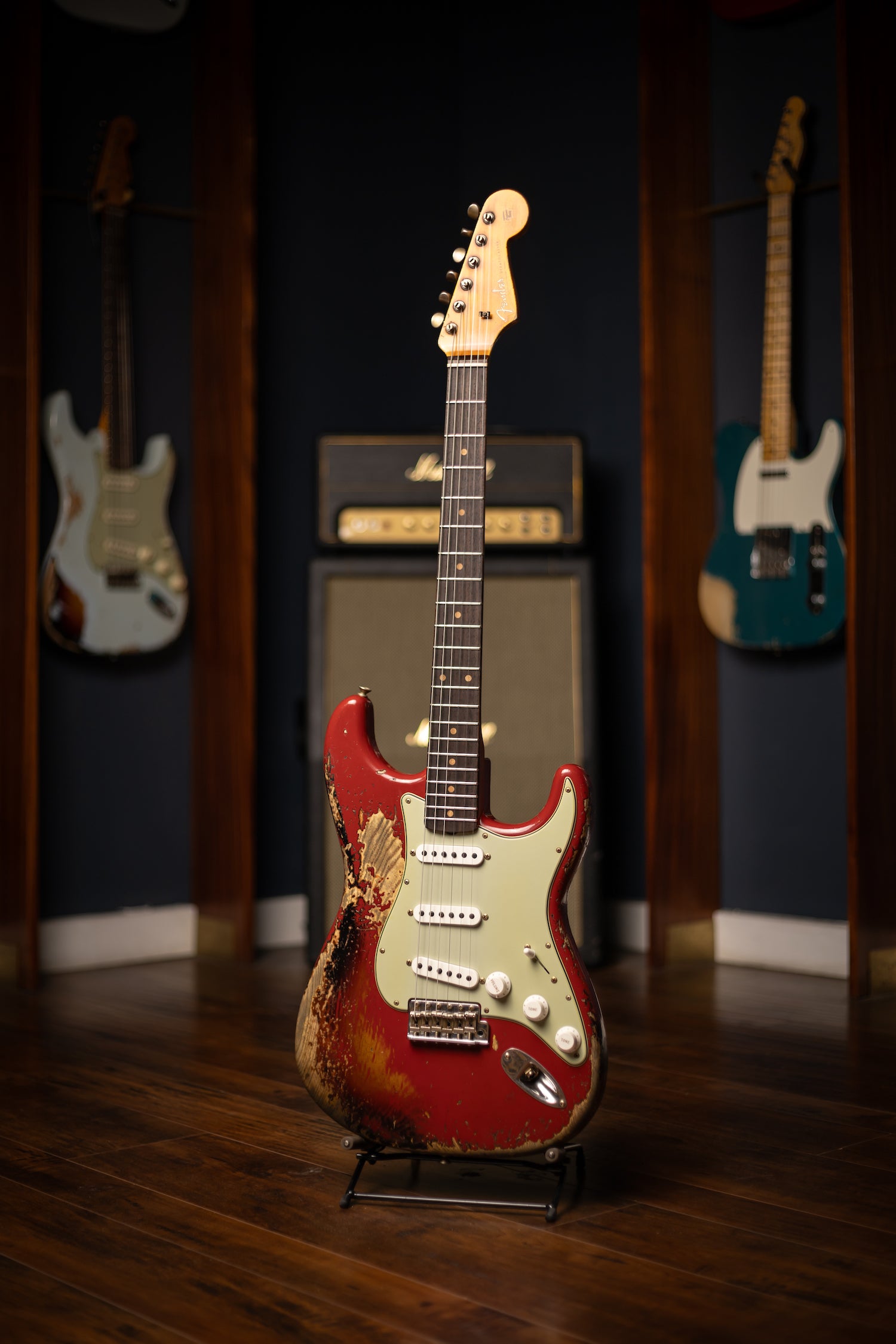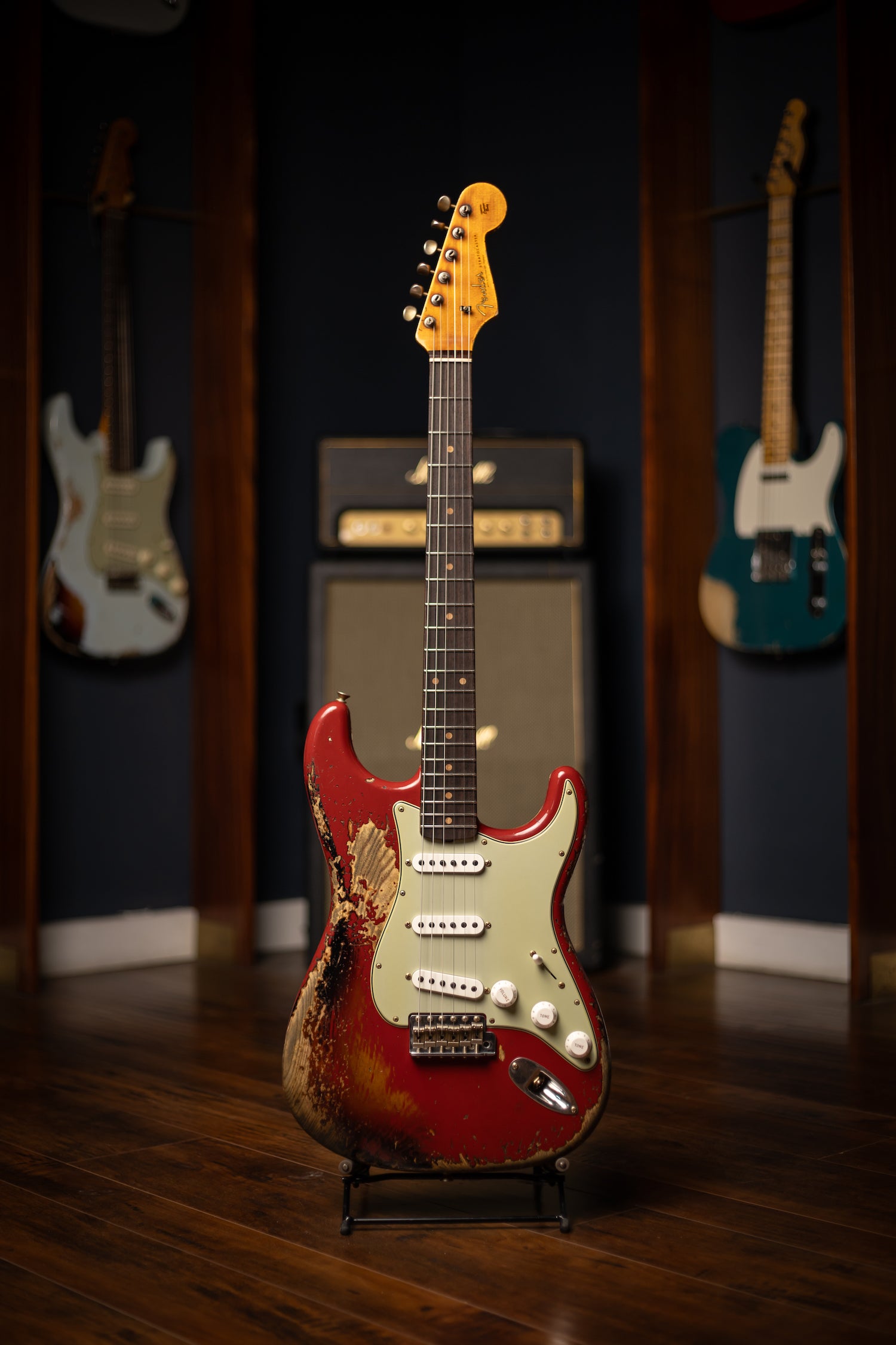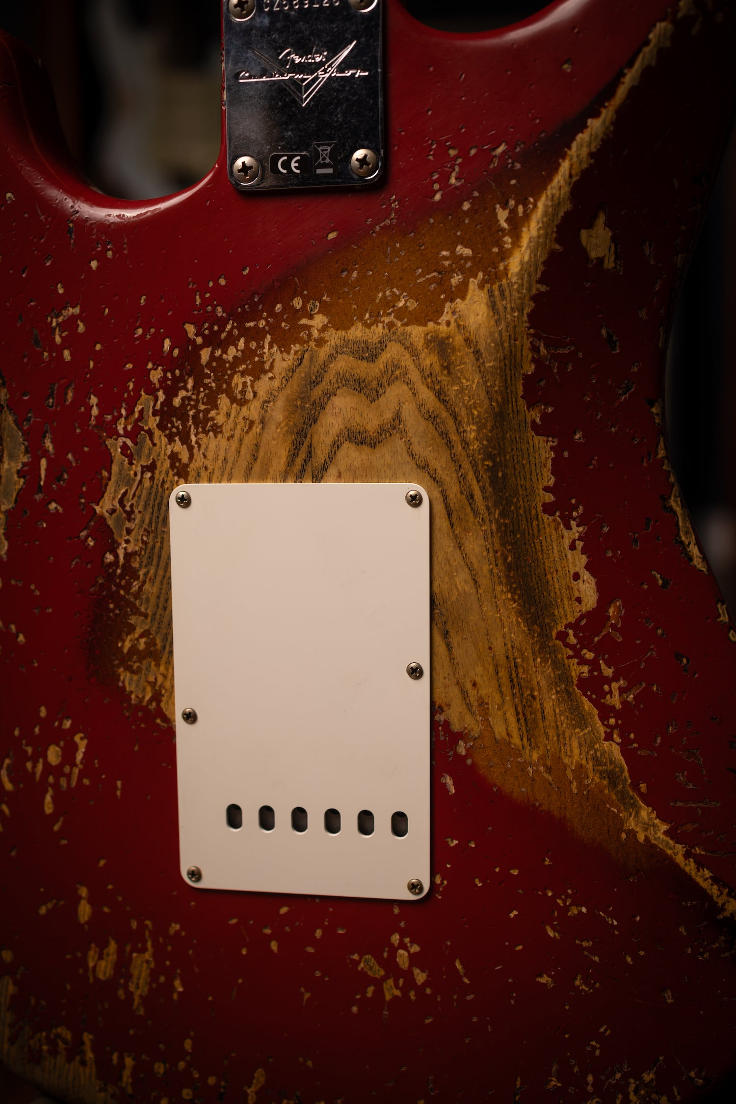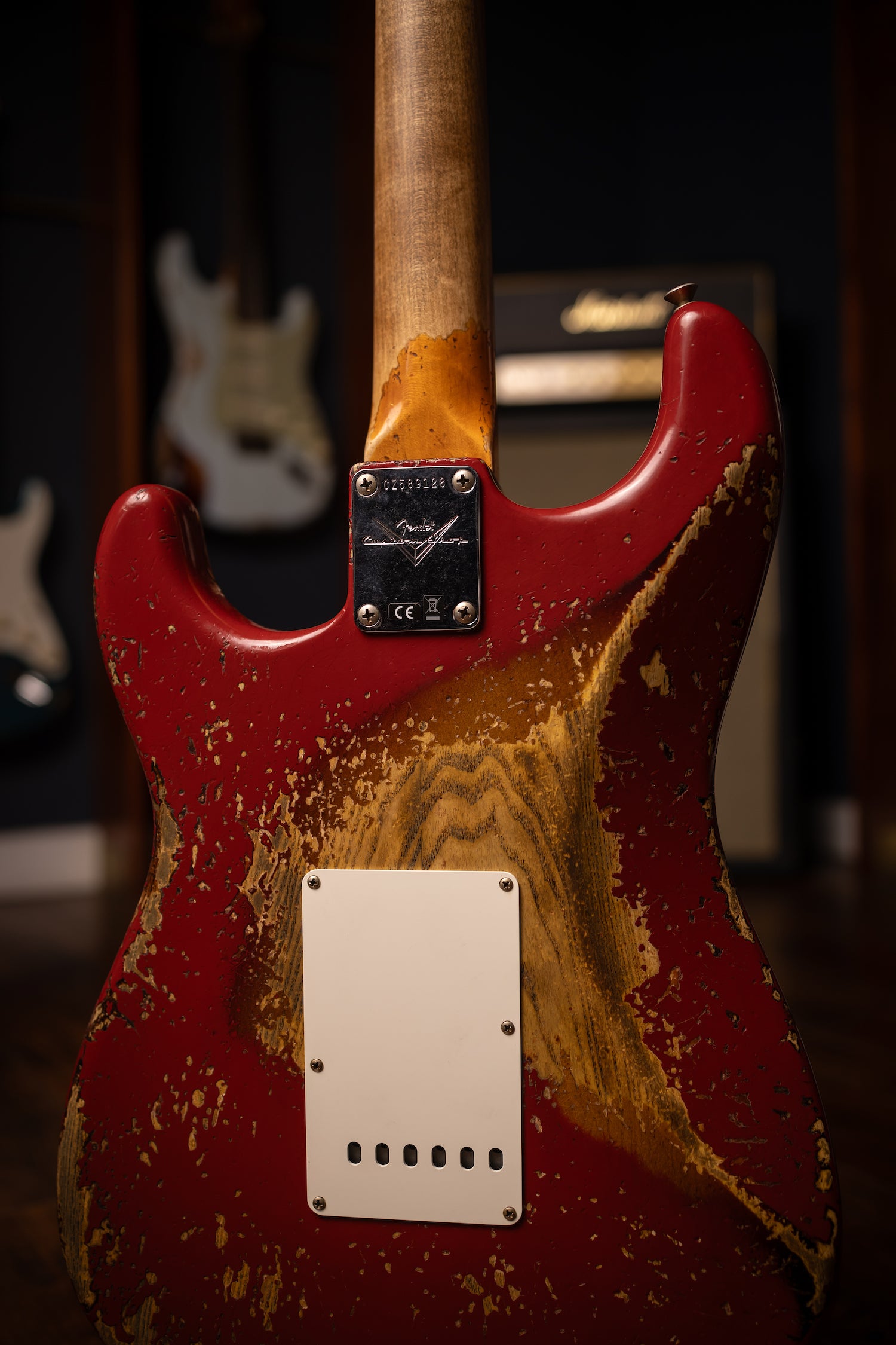 Super Heavy Relic® Lacquer Finish; 2-Piece Select Ash Body; Quartersawn Maple Neck with '60s-Style Oval "C" Back-Shape; 3A Rosewood Fingerboard; 9.5" (241 mm) Radius; 21 Narrow Tall (6105) Frets; Custom Shop Hand-Wound Fat '60s Single-Coil Strat® Pickups with RWRP Middle; Vintage Modified Strat® #2 Wiring; 5-Way Switch; 3-Ply Parchment Pickguard; Custom Shop Vintage Synchronized Tremolo; Vintage-Style Tuning Machines with Fender® Logo; Bone Nut; American Vintage '59-'64 String Tree; Deluxe Hardshell Case; Strap; Certificate of Authenticity.