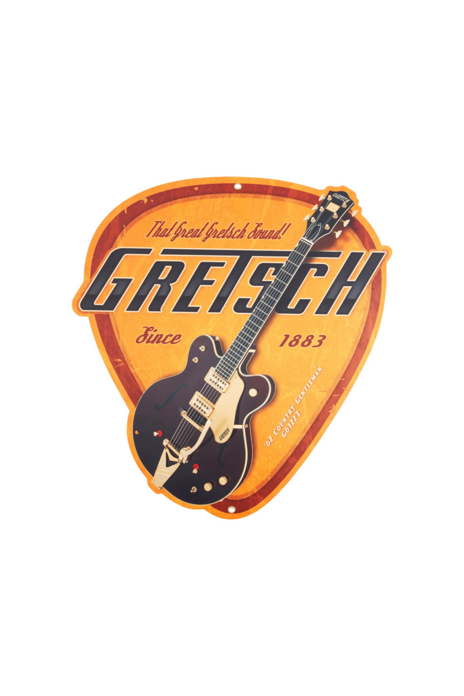 This Gretsch® Pick Vintage Tin Sign is perfect for your music room, office or fan cave. It features a Country Gentleman® guitar on a pick-shaped background. (Dimensions: 19" x 16" x 0.1")