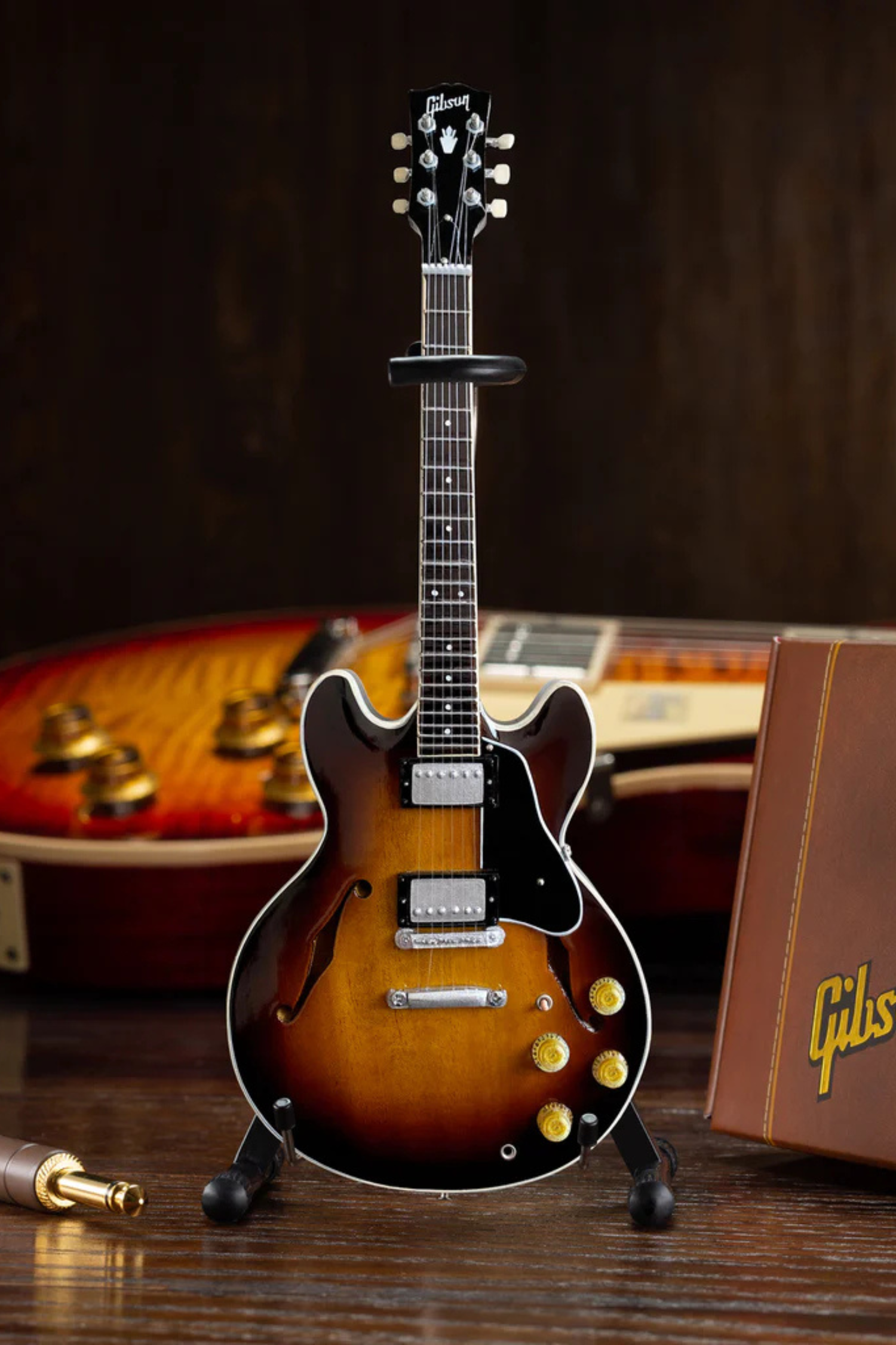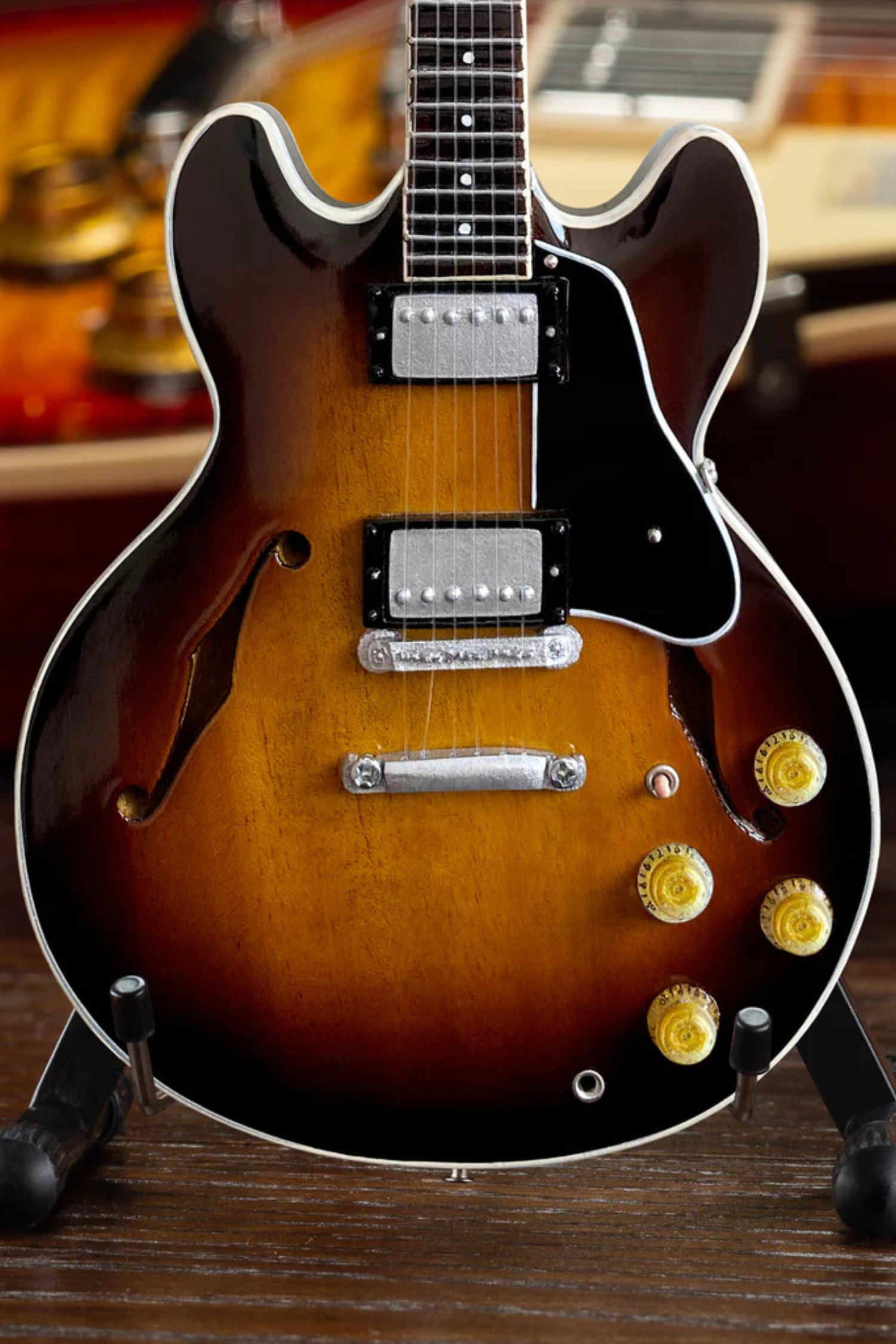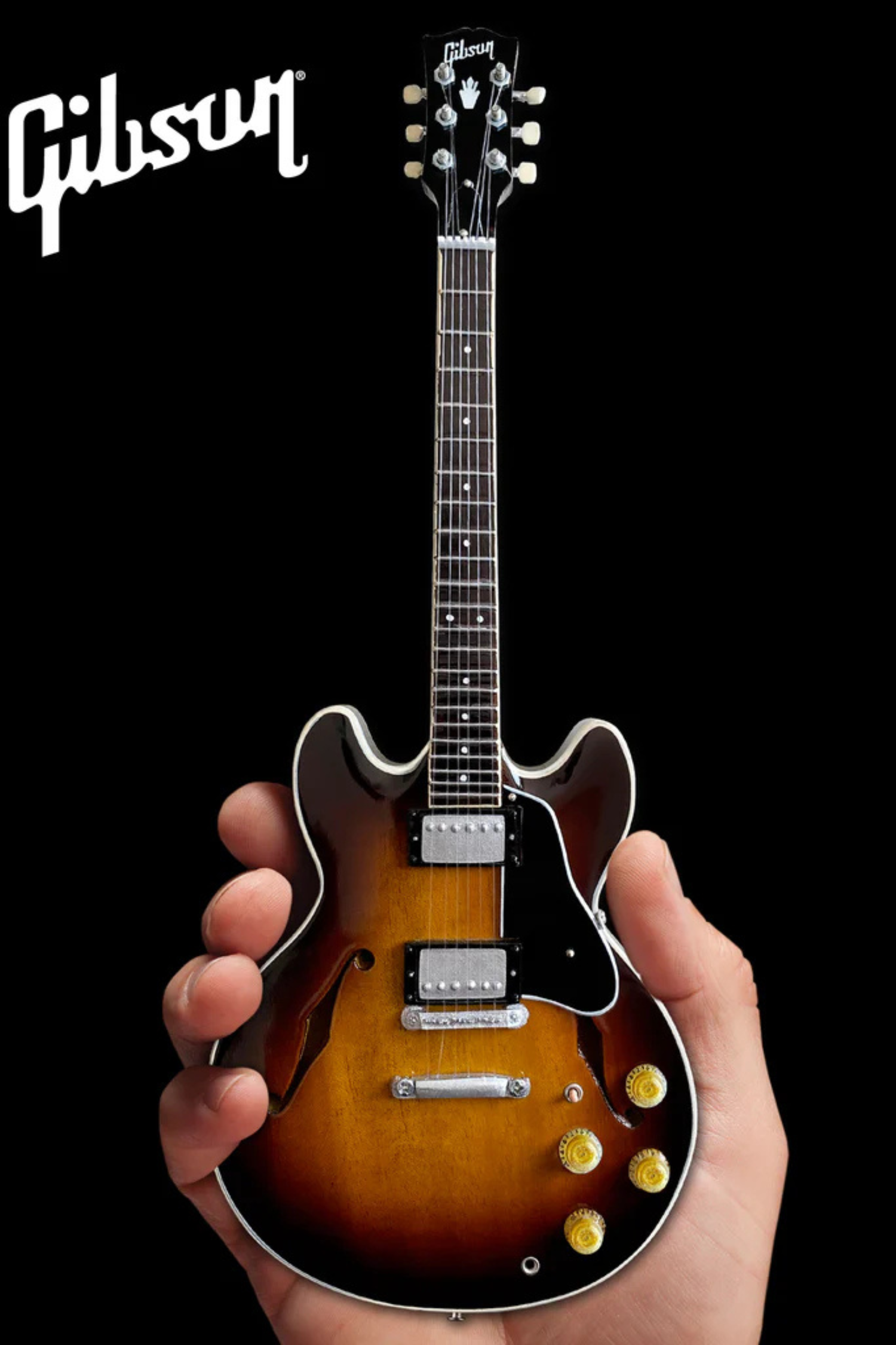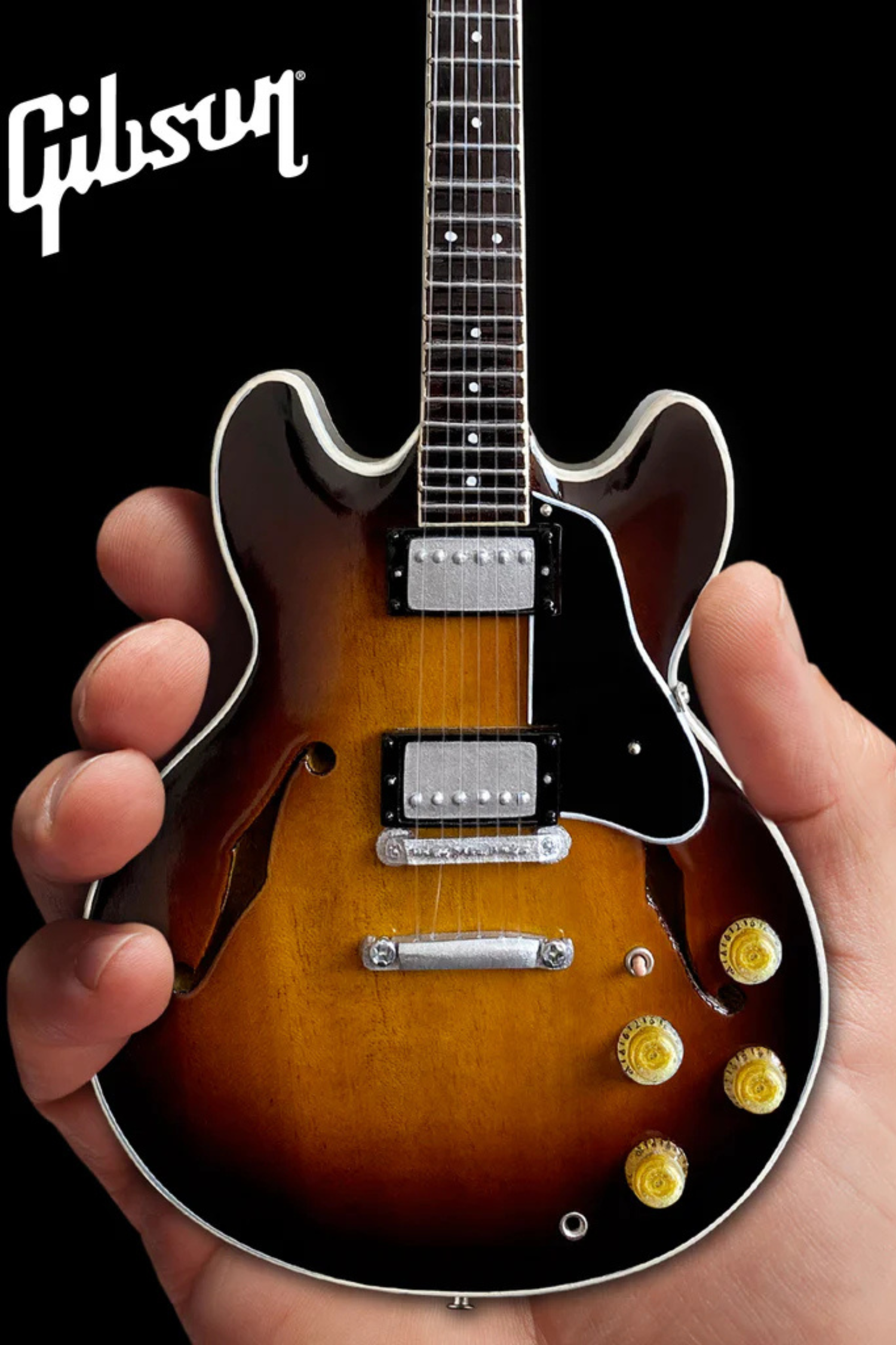 This miniature replica model honors the legendary Gibson guitars. The vintage sunburst stain on this handcrafted collectible is an amazing reproduction of the classic original hollow body instrument.