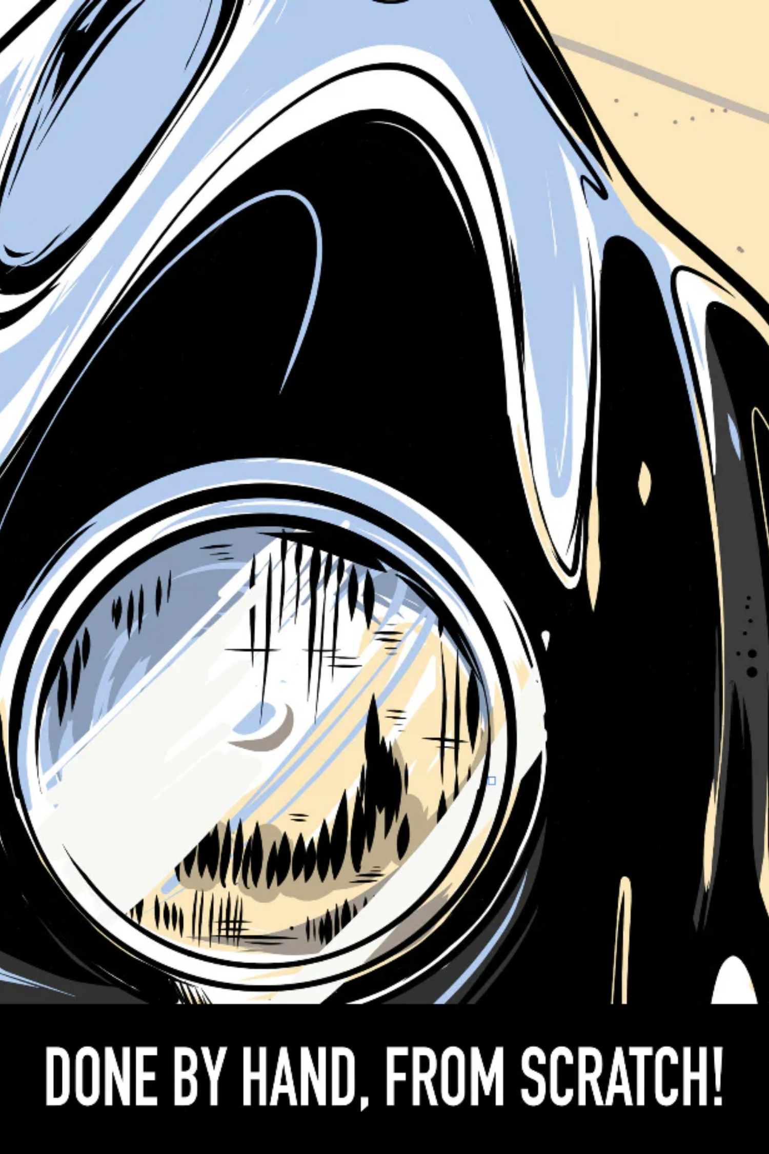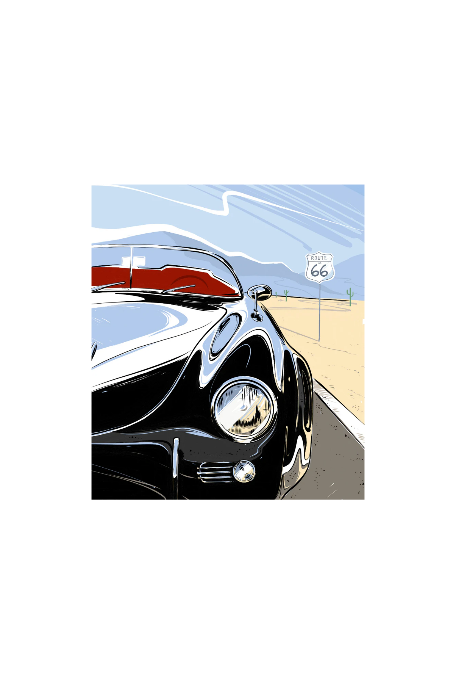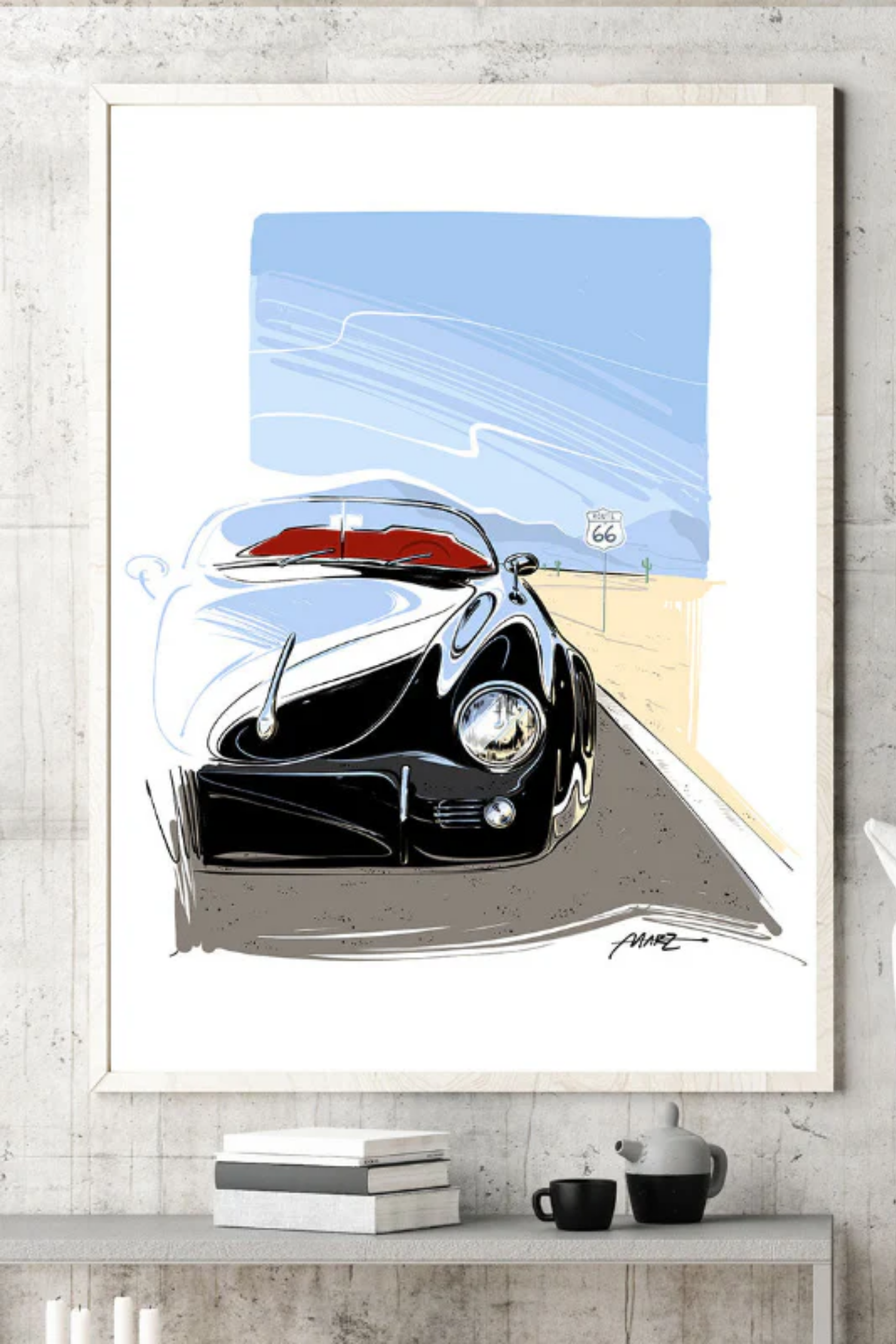 The Porsche 356 "Outlaw on Route 66" - (1 of 50) is artistically re-imagined in Alex Marz' signature art style.. Alex's art style is unlike any other artist, showcasing his signature sweeping calligraphic lines and reflections that create a wow factor as soon as you see the art. His attention to linework weights and detail really makes his surreal artwork memorable.. As a former designer at Audi Porsche VW Group LA, Alex visually showcases a unique style that blends art, industrial design, composition and class. with over 20 years of painting experience combined with Automotive experience.. A true master that mixes Art and engineering in a very compelling manner.
