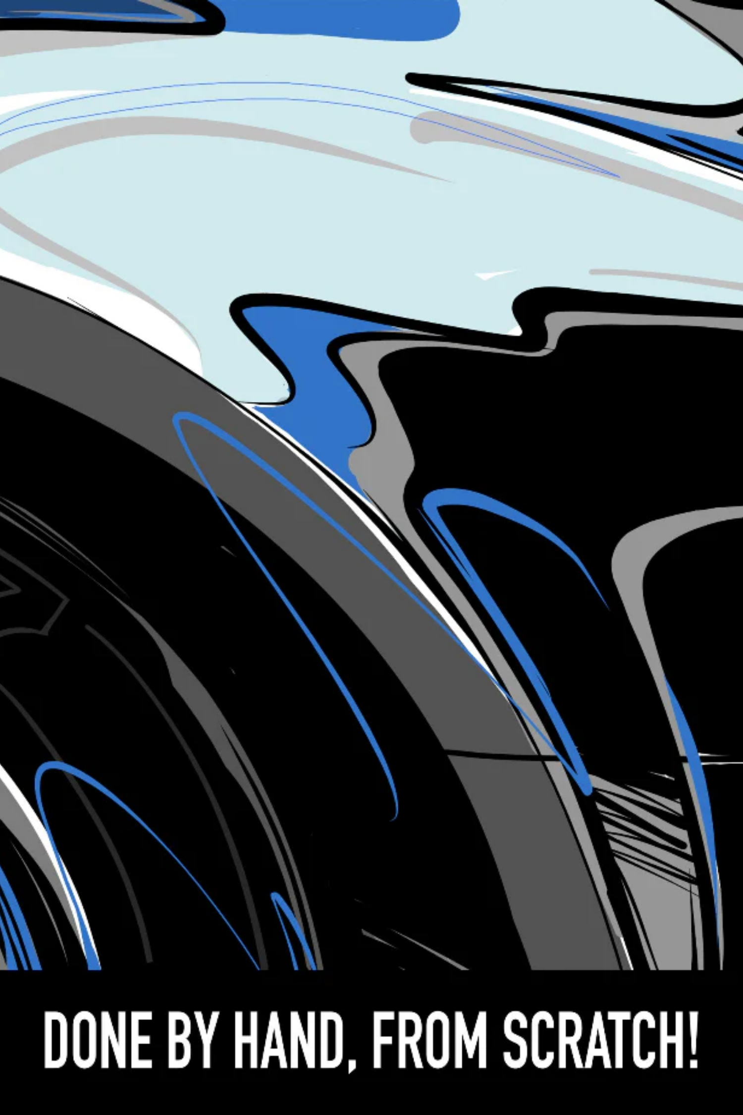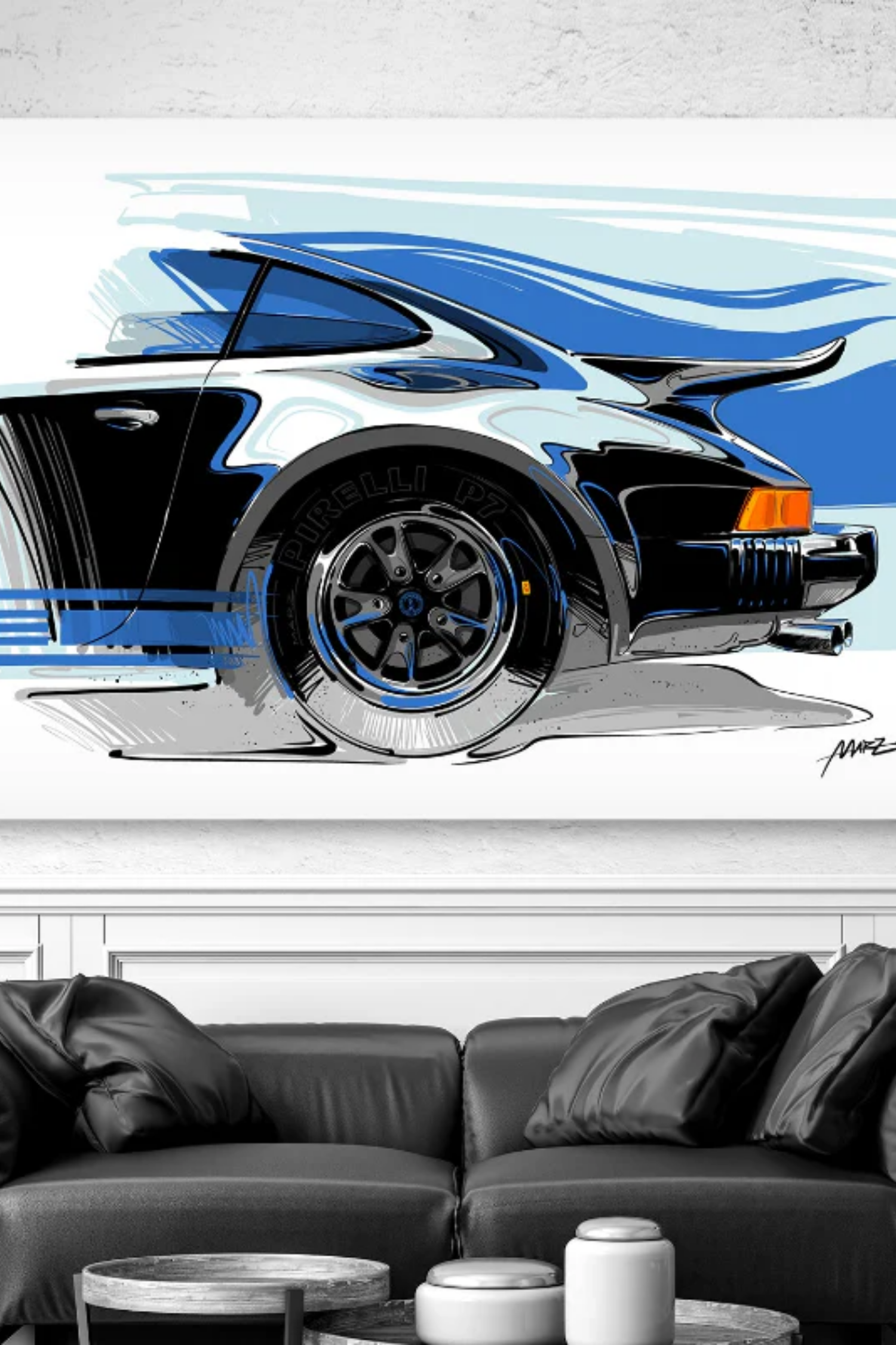A vintage 1984 Porsche 911 SC LIMITED EDITION (1 of 50)  re-imagened artistically with sweeping calligraphic lines and reflections. Alex Marz' signature art style is unlike any other artist. His attention to linework weights and detail really makes his surreal artwork stand out.. As a former designer at Audi Porsche VW Group LA, Alex visually showcases a unique style that blends art, industrial design, composition and class. All work is created in Vector format (allows it to scale at any size without losing resolution)