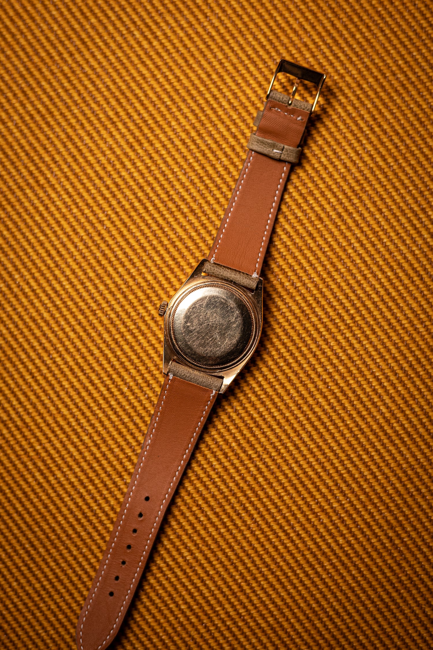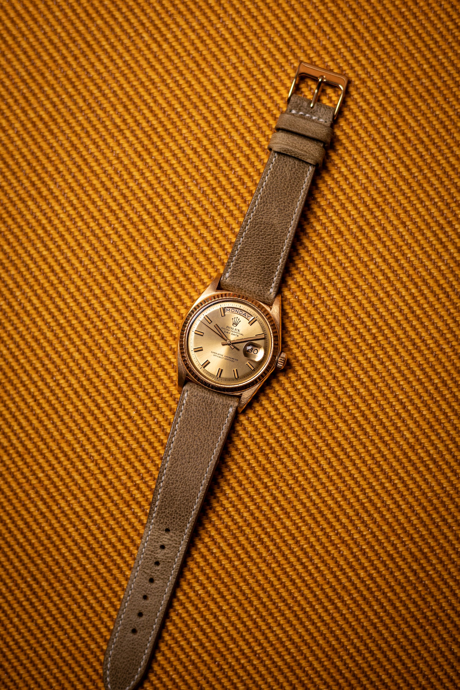 The applied gold markers and hands have developed a warm, even patina, and the case shows only light surface wear. The olive leather strap gives the watch a slightly sportier business-casual look. Inside is the Rolex Caliber 3055 automatic movement, with quickset date and hacking seconds—a noticeable step forward from earlier Day-Date movements. Overall, this is a well-preserved example of the 1803: refined, functional, and true to the design that made the Day-Date a cornerstone of the brand.